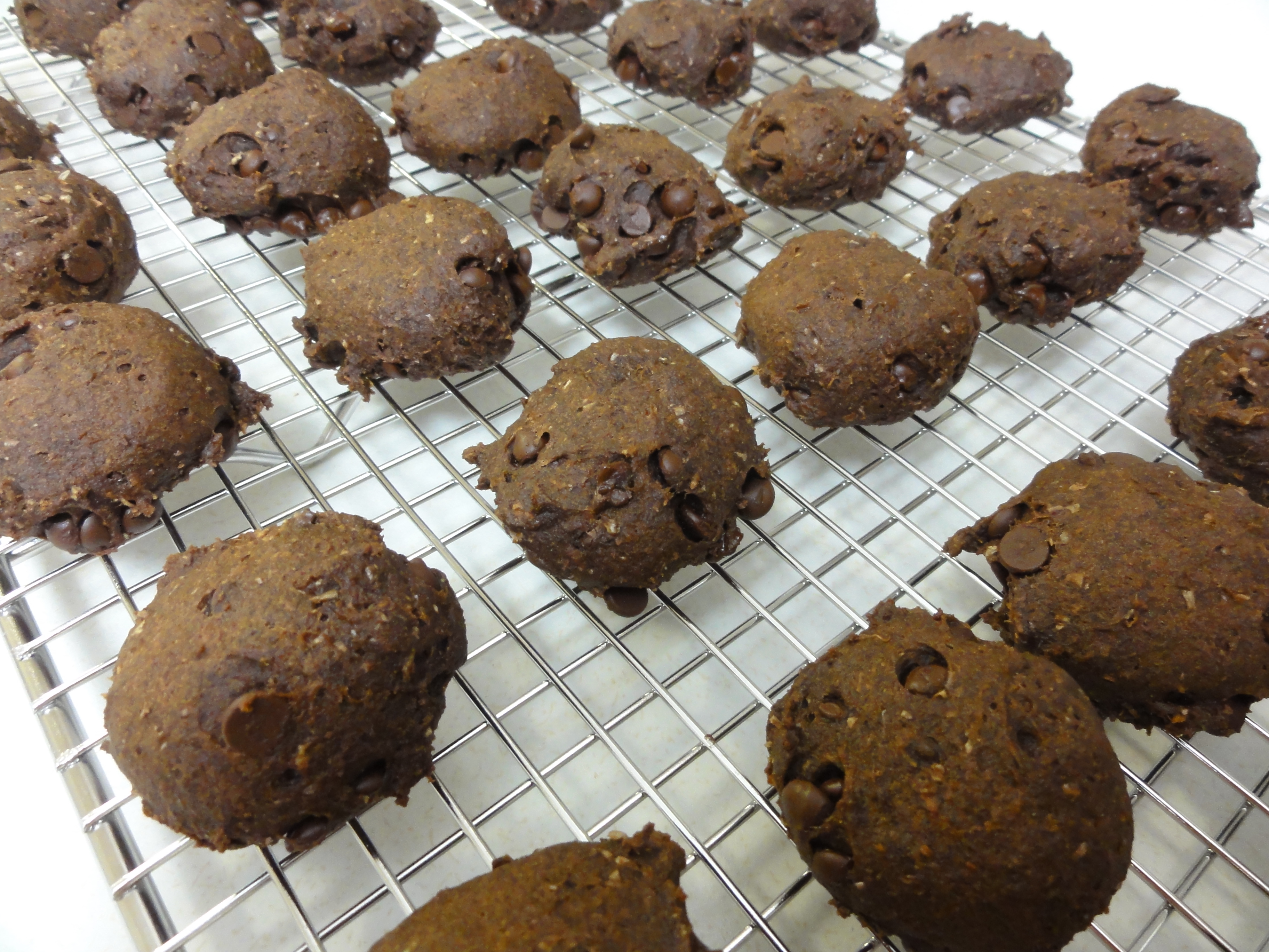 Vegan chocolate pumpkin spice cookies on a cooling rack