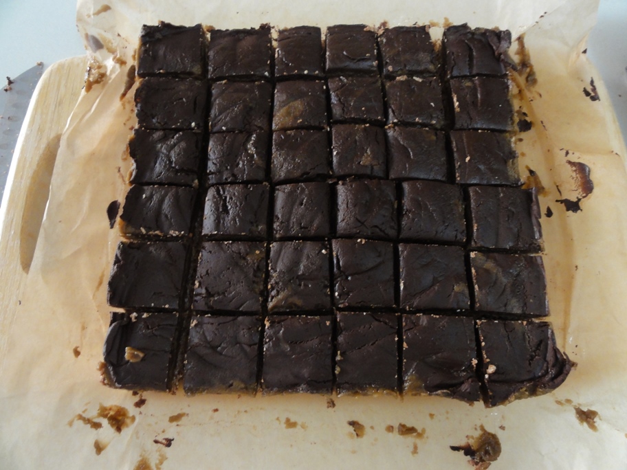 - Cut into squares with a sharp knife then cover with plastic wrap and return to the fridge to allow the chocolate to harden.