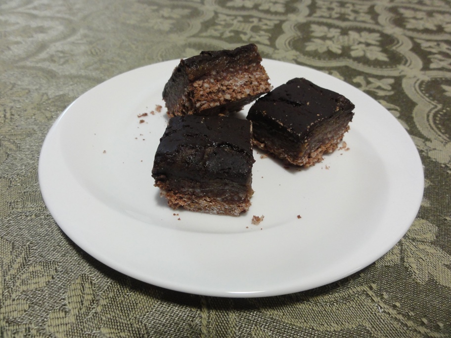 - On taste, the crust is fine, I have no issues there. I was concerned about the coconut flour overwhelming the base because it’s fairly strong in flavor, but that didn’t happen. The middle tastes like sunflower butter, which apparently I’m not that keen on. The top is in good shape too; the chocolate definitely did get sweetened by the maple syrup, so if I could resolve the texture issue I think it’d be fine.