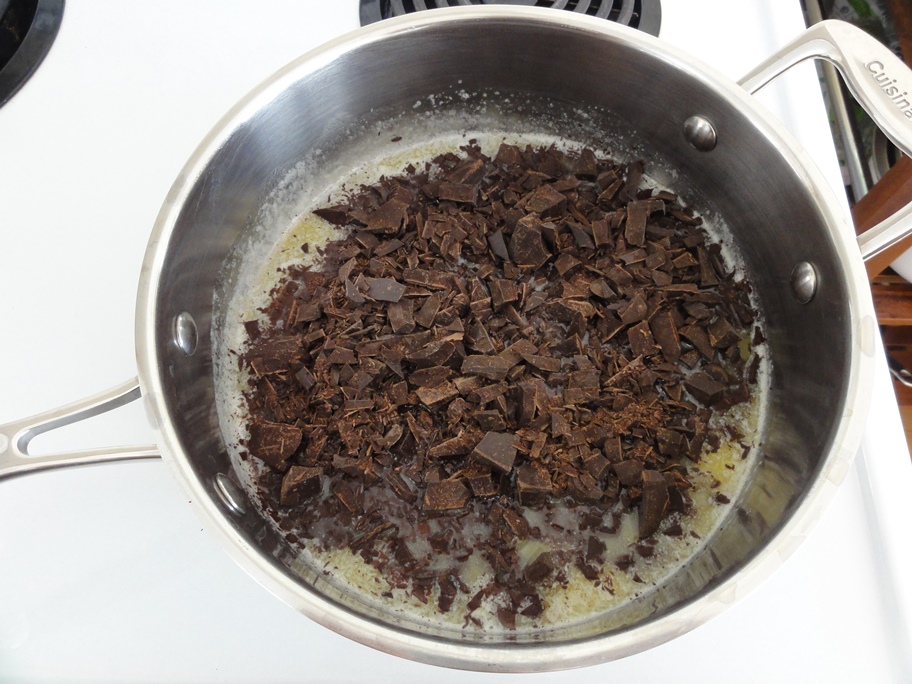 - Another thought on chocolate (it seems appropriate for this recipe to be thinking a lot about chocolate): if you can’t get your hands on blocks of chocolate, chips will do just fine. The 5 oz. of unsweetened and 4 oz. of bittersweet needs to be chopped up so that it will melt in a reasonable amount of time. If you’re starting with chocolate chips then it’s already “chopped” and you don’t need to chop it any further; just don’t forget to keep your two 4 oz. quantities separate so that you’re folding in the 4 oz. of chips towards the end – you wouldn’t want to miss out on melted gems of gooey chocolate!