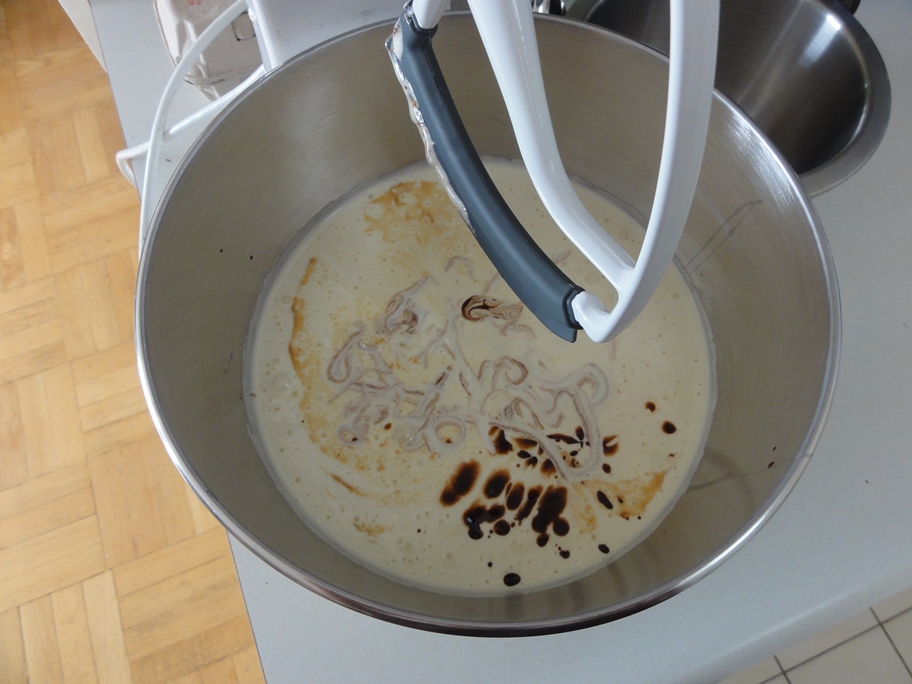 I switched to the stirring attachment after pouring in the vanilla and chocolate because the side-scraper makes my life easier. The whisk would probably have still sufficed as the dough stays fairly fluid.