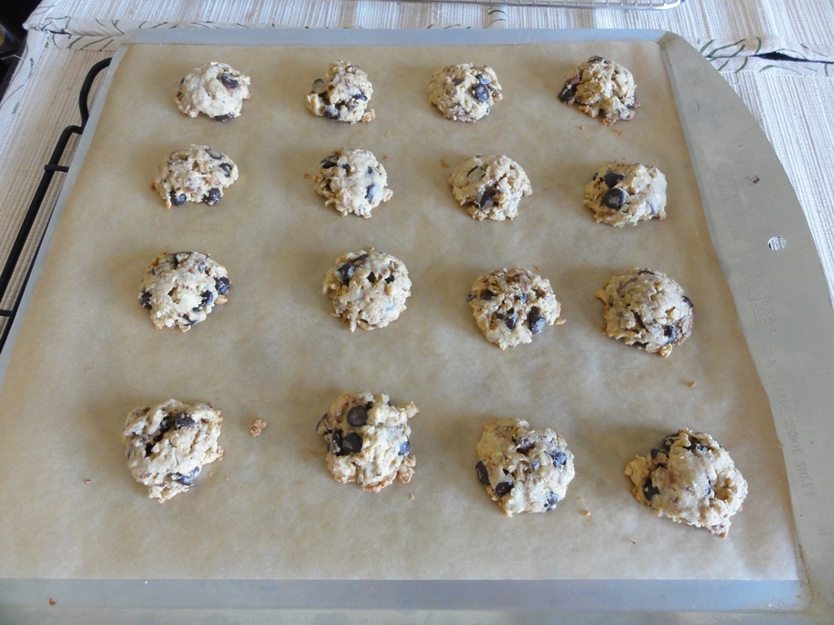 Towards the end of May I baked some delightfully chewy, not overly sweet, Oat Chocolate Chip Cookies, courtesy of “The Clever Cook“, by Lucy Doncaster. The first batch made a lot of cookies, roughly four dozen, but it wasn’t quite enough for what I was baking for. Two full batches would’ve been far too many so on a whim I halved the second batch, put one half in the fridge to chill for an hour before baking, and put the other half in the freezer.