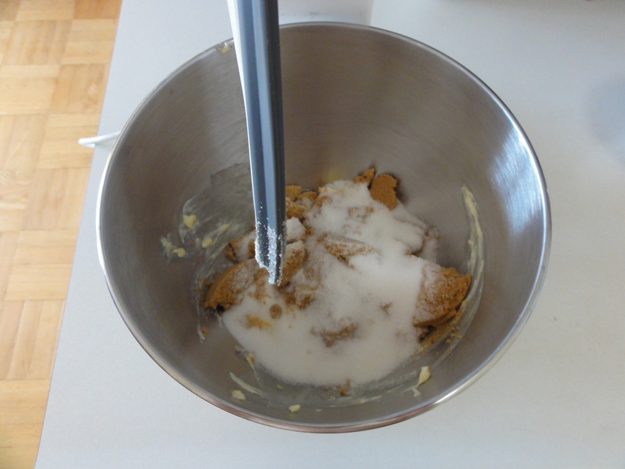 - Cream the butter and sugars together on low speed for about minute, and then on medium speed until light and fluffy; about 3 minutes.