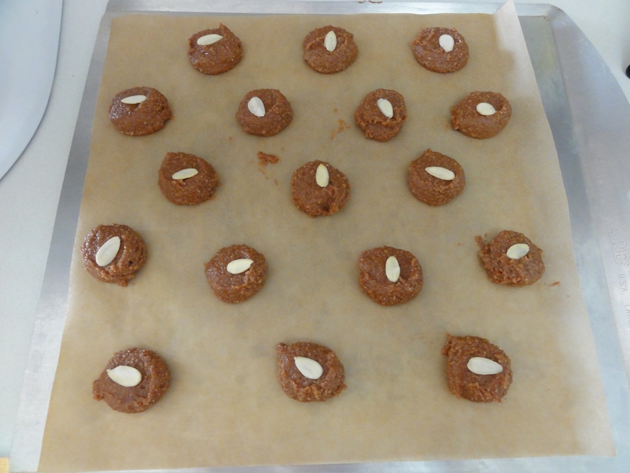 - Spoon level tablespoonfuls of dough onto the baking sheets. Press a slivered almond into the center of each cookie.