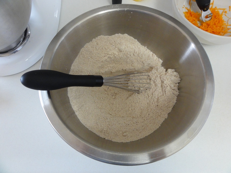 - Whisk together the flours, baking soda, xanthan gum, salt, and spices in a medium bowl. Add the orange zest and mix in well.