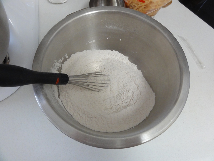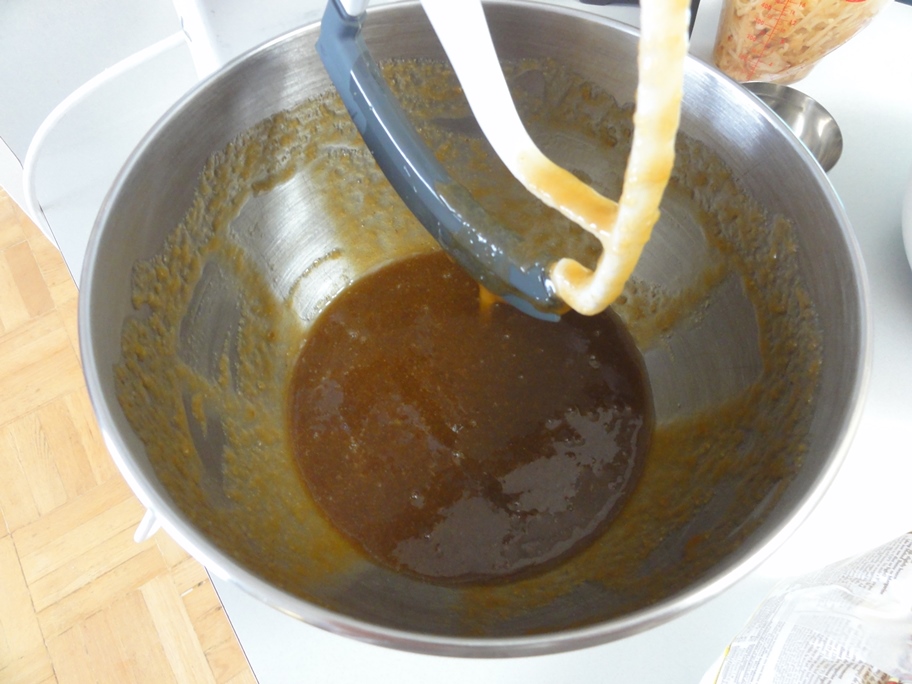 It’s been a while since we last had an action shot of the stand mixer, so here it is with the last of the dry ingredients added in. Remember to add the dry ingredients in small quantities at a time (~1/4 cup is fine).