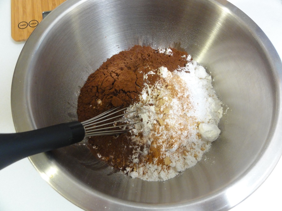 - In a medium or large bowl, whisk together the flour, baking soda, salt, cinnamon, ginger, nutmeg, xanthan gum, and cocoa powder.