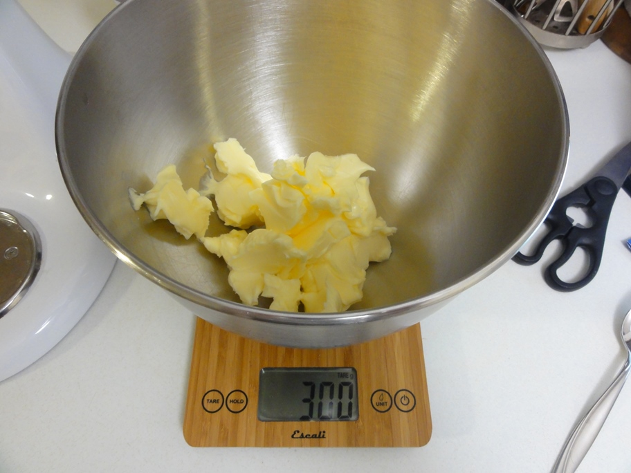 300g is just shy of three sticks of butter. That’s a lot of butter. I’m using my stand mixer’s bowl directly here and just hitting the “tare” button to reset the scale between adding ingredients.