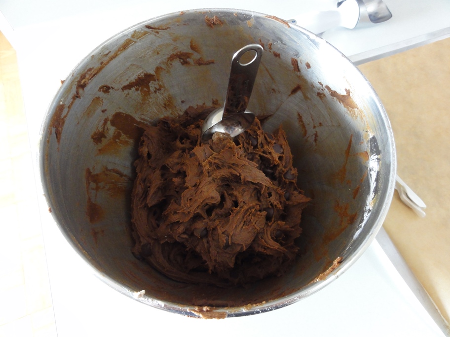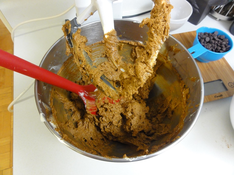 The dough gets sticky in a hurry when you’re adding in the dry ingredients (this is one reason for refrigerating it; forming cookies with the fresh dough would be all but impossible). Take it slow and don’t add more than a quarter of the dough at a time; I worked in portions of about 1/6th of the original dry mix. Towards the end it will probably be too much for your mixer and you’ll want to resort to a spatula and elbow grease.