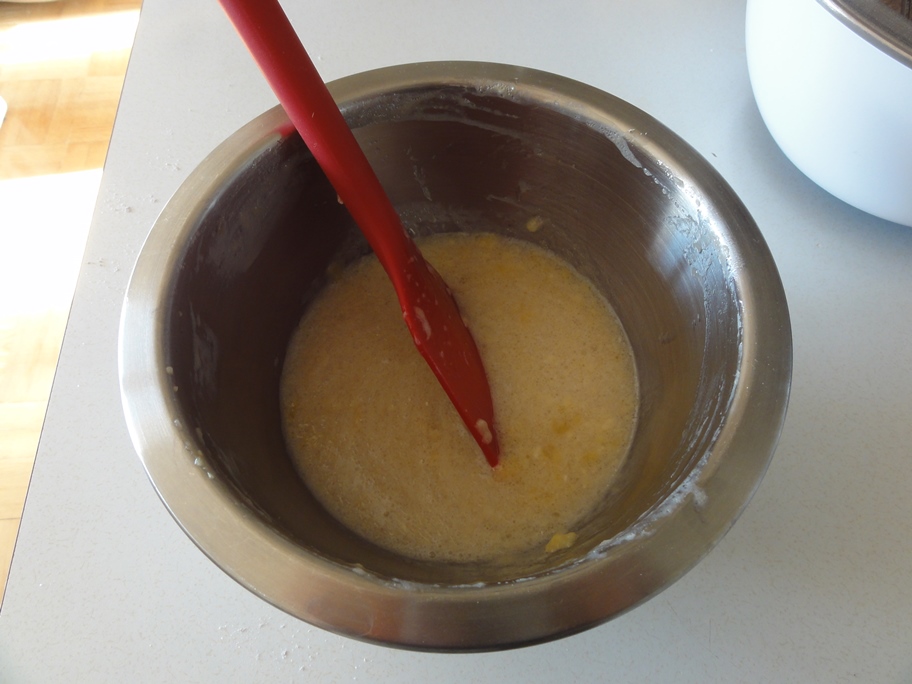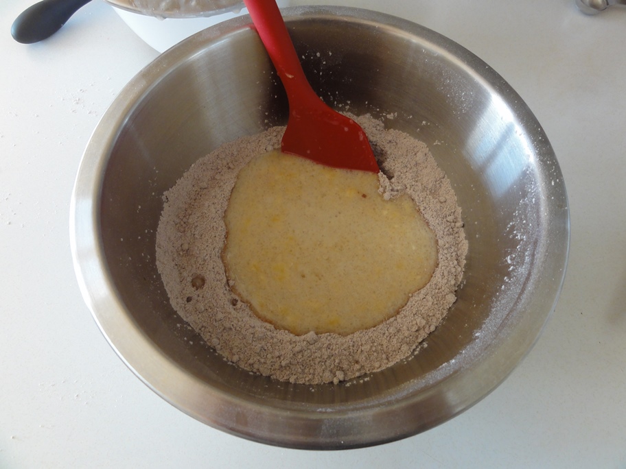 The wet ingredients should come to a consistent, smooth texture when beaten into submission with a spatula.