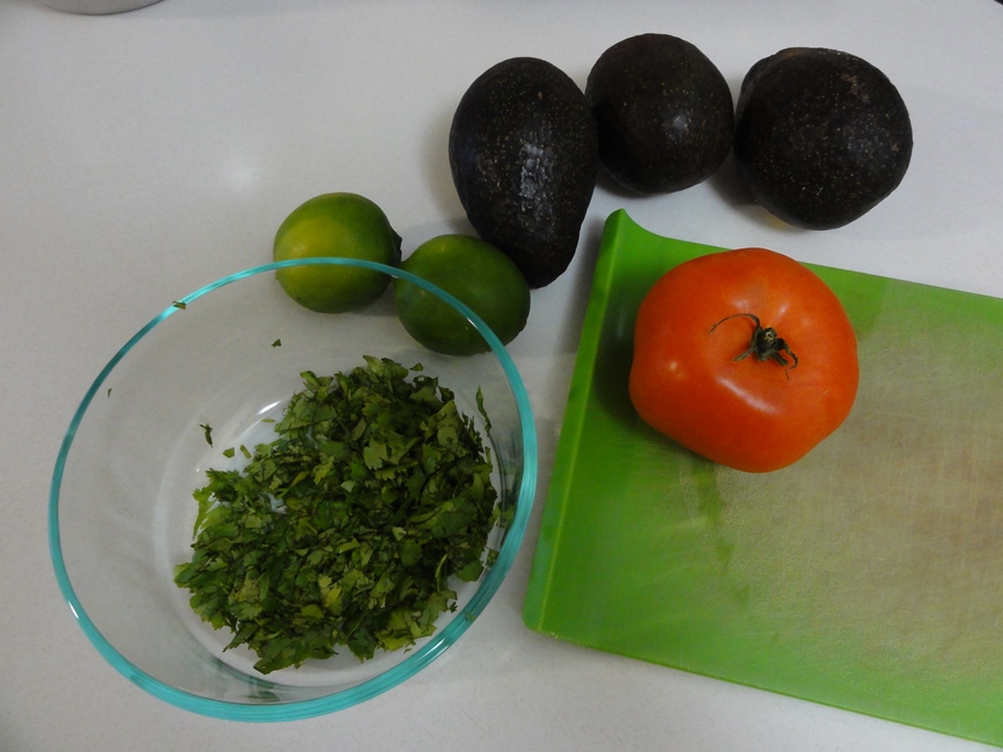 Start with chopping up the cilantro. We’ll deal with the avocados last because once they’re exposed to air they’ll start to spoil, and that distinctive browning is something we want to avoid.