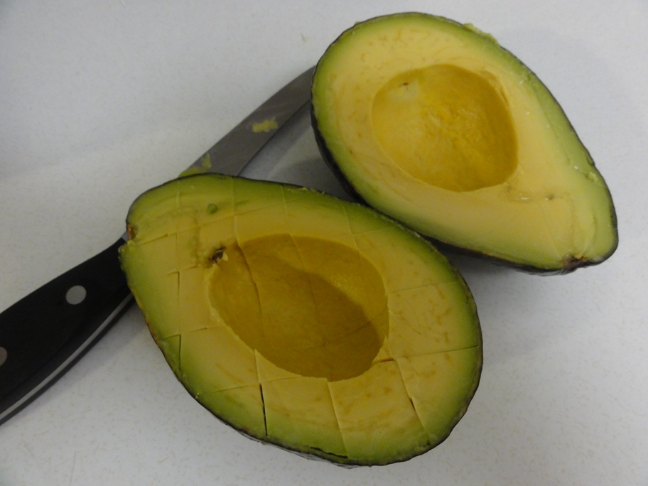 Cutting lines into the avocado aids scooping everything out with a spoon.