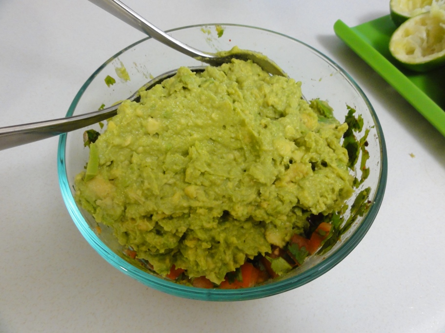 - Add the mashed avocado to everything else, mix everything together, and level out the top.