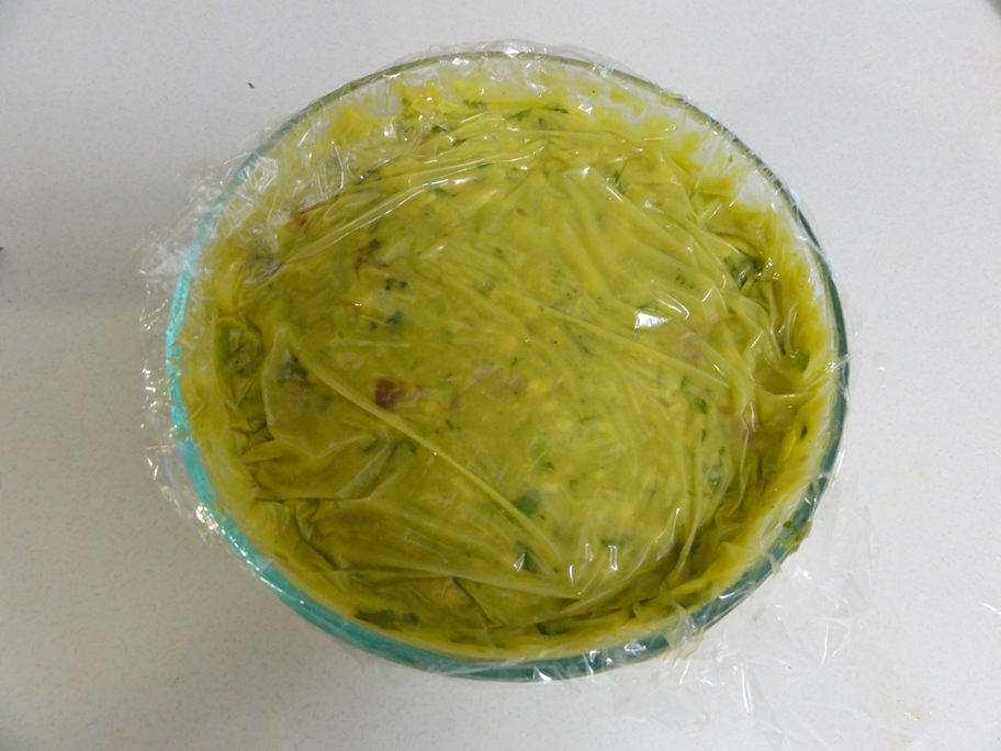 The last step serves to preserve the guacamole from going brown between when you make it and when you eat it. First you’ll want to smooth out the guacamole so that you’ve got a relatively even surface on top; this makes sealing it in with plastic wrap easier. Then juice the remaining lime over the top and shuffle the bowl around to make sure the guacamole is completely covered by a layer of juice. Finally apply a layer of plastic wrap over the top, starting in the middle and working your way out to ensure there’s nothing but lime juice trapped between the plastic and the guacamole.