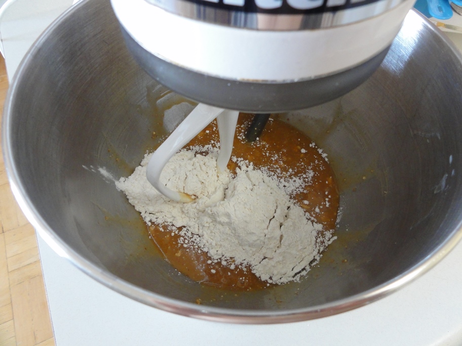 When adding in the dry ingredients it helps to go slowly and add a little bit at a time, to avoid spraying flour all over the kitchen counter (and yourself).