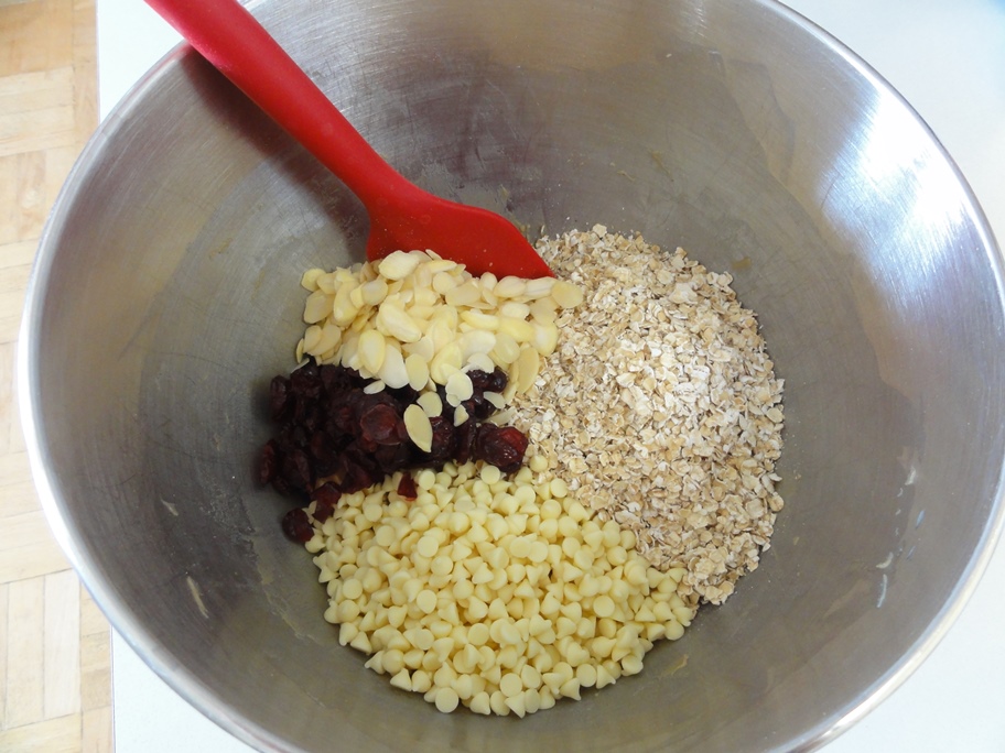 - Fold in the oats, white chocolate chips, dried cranberries, and almonds.