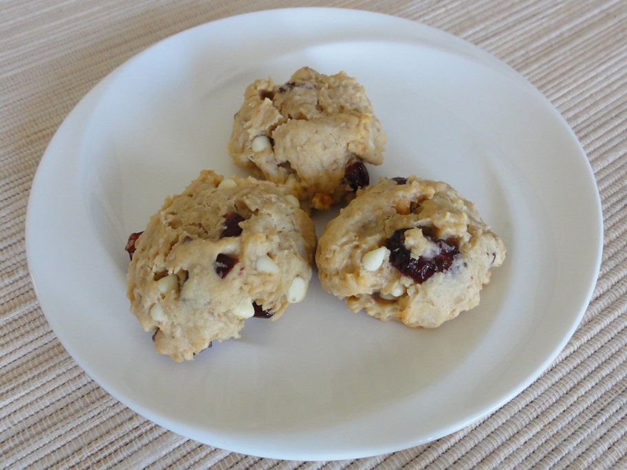 The first batch of these that I made included the coconut, almonds, and cranberries specified in the original recipe. I didn’t have any pistachios on hand and I figured dried cranberries were better on their own than being mixed with raisins. The combination of flavors with coconut and peanut butter didn’t work that well for me though, so I decided to make these somewhat unhealthy by swapping the coconut for white chocolate chips and doubling the quantity. I also upped the flour content, to push the end result closer to the consistency of the Oat Chocolate Chip Cookies that I’m very fond of. The second batch turned out great, with the peanut butter, white chocolate, and cranberries coming together in a delicious combination.