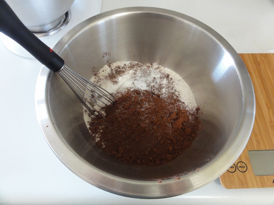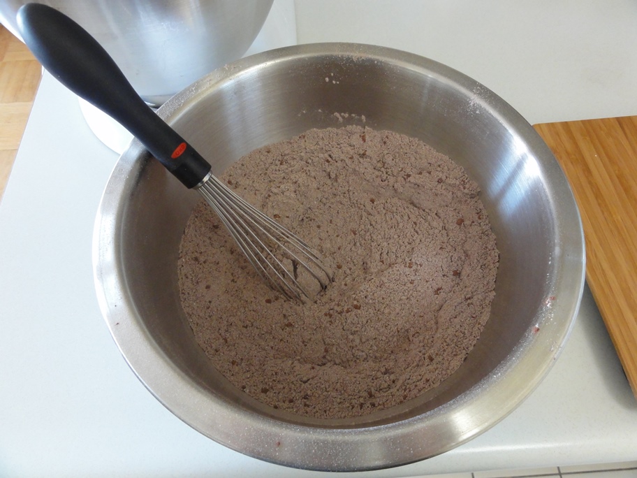 Start with your dry ingredients. There’s a nice mix of colors so you can be satisfied that you’ve thoroughly whisked everything together once you have a consistent color and pattern. My cocoa powder tends to clump a bit, thus the brown dots in the mix.