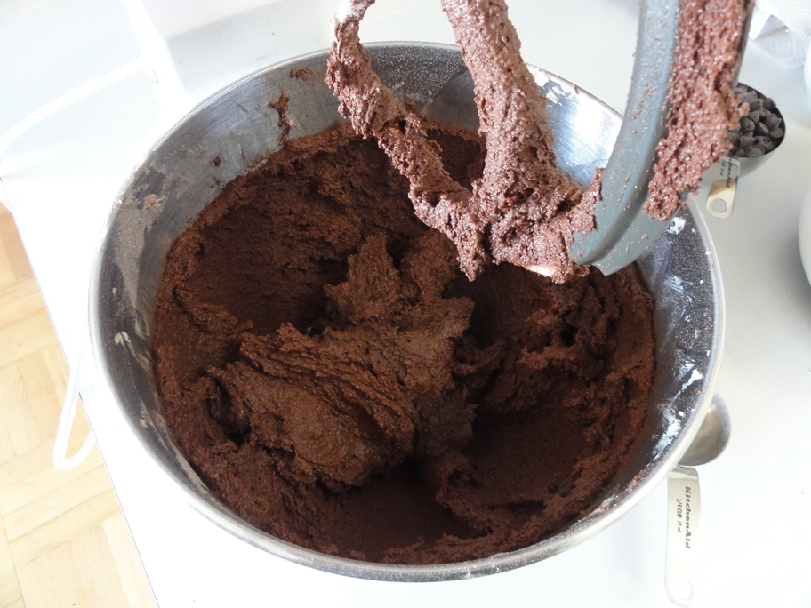 Now you can add in the dry ingredients, just a little at a time. I used a 1/2 cup for this and kept the mixer running on low speed. The dough will still be fairly moist once everything’s in.