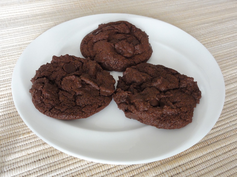 These cookies do spread out a bit on the trays, so give them plenty of room to themselves. Considering all the cocoa powder involved you won’t be able to tell a color change, that “edges turning golden brown” cue that lets you know cookies are done, but the tops should be crispy and feel soft and spongy if you push them a little with a fingertip.