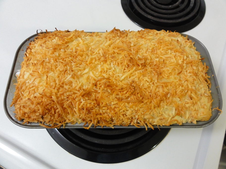Now you can pour the batter into the pan and spread over top the remaining 1/2 cup of coconut. You’ll notice here that mine’s already been toasted, because unlike in Melissa’s recipe I toasted all 1 1/2 cups at first, but I don’t recommend doing that because the resulting topping came out a little over-toasted. On the plus side, the topping didn’t burn, so it’s not a huge problem if you make the same mistake I did.